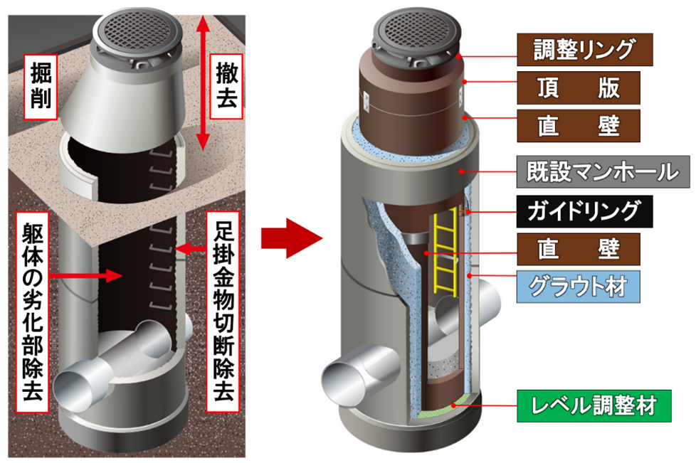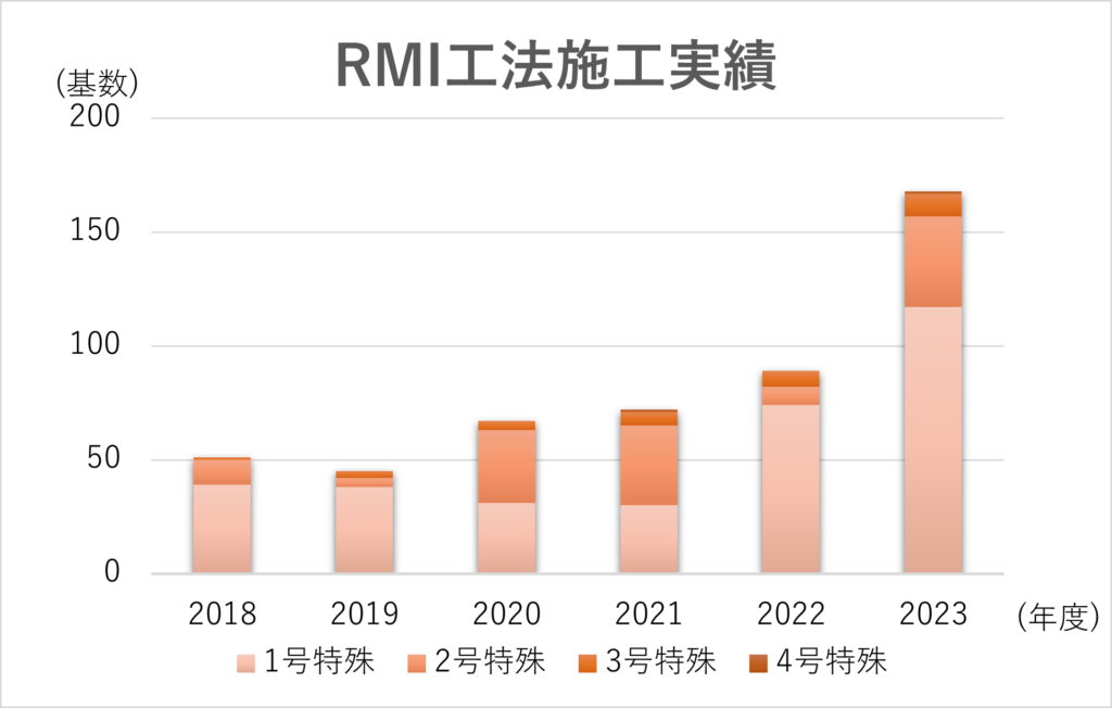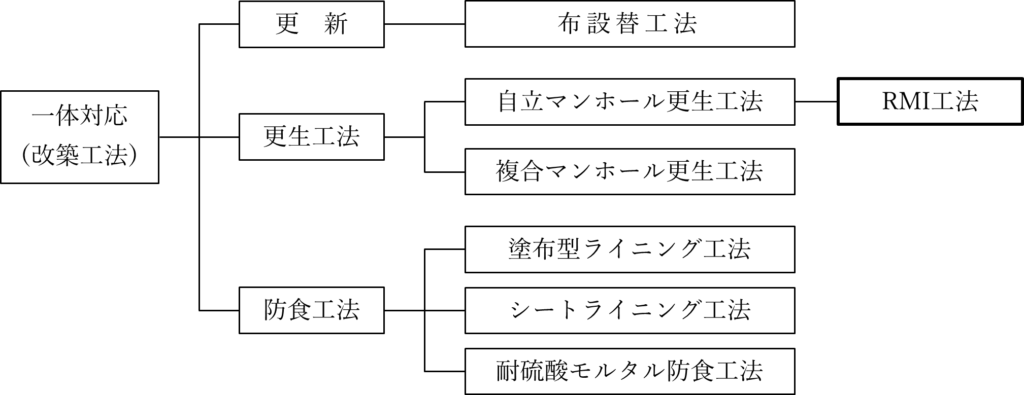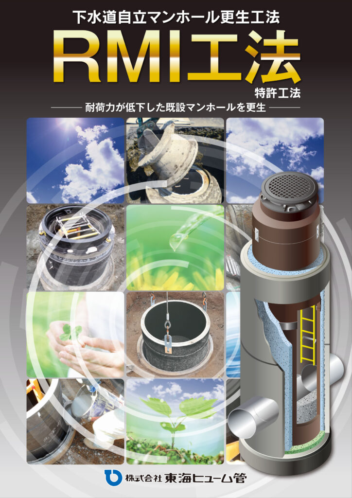 RMI工法は劣化したマンホールの中にRMI工法用のレジンコンクリート製マンホールを挿入する自立型の更生工法です。他のマンホール更生工法と比べて工期の短縮が図れ、地元の施工会社で施工ができます。適用対象は腐食によって減肉し、耐荷力や耐震性能が低下したマンホールとなります。使用する部材はレジンコンクリート製マンホールと同等の性能を有しており、10mまでの深さをもつマンホールにも適用できることが特徴です